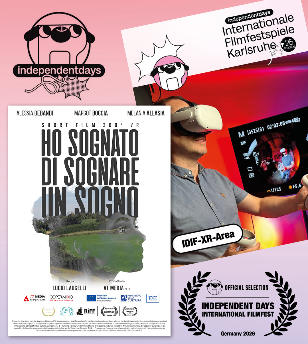 Importante riconoscimento internazionale per il cinema immersivo italiano: il cortometraggio “Ho sognato di sognare un sogno”, diretto da Lucio Laugelli e prodotto da AT Media, è stato selezionato all’interno della XR Area dell’Independent Days International Filmfest, tra i principali festival europei dedicati al cinema indipendente. La