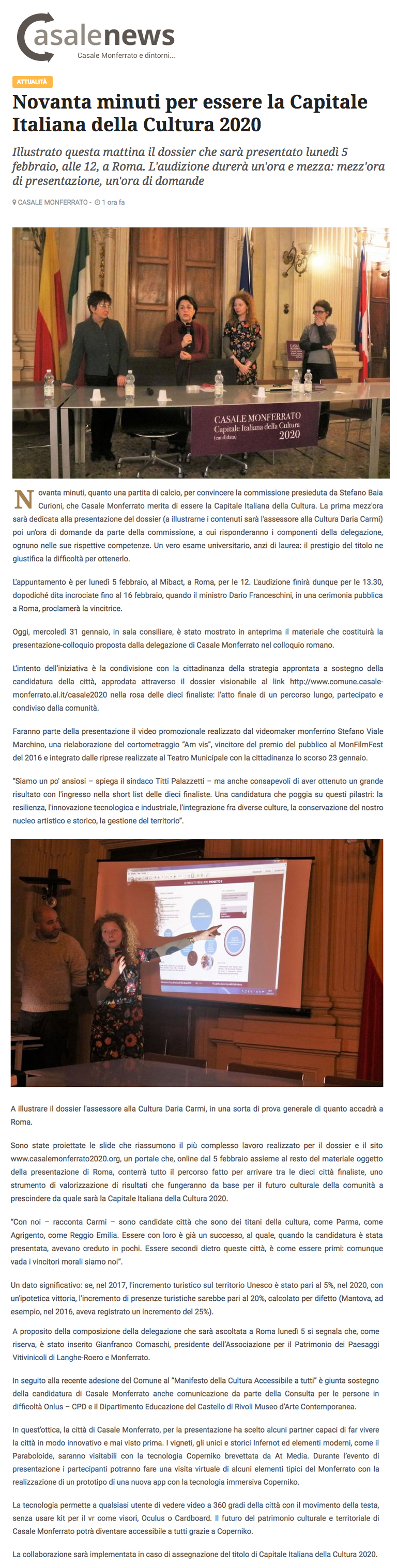 Nella Sala consigliare del Palazzo municipale di Casale Monferrato è stato presentato in anteprima il materiale che verrà visionato all’audizione “Capitale Italiana della Cultura 2020” che si terrà il 5 febbraio a Roma. Durante l’evento i partecipanti potranno vedere virtualmente alcuni elementi della città con la tecnologia Coperniko. Il nuovo prototipo di APP permetterà di muoversi nei contenuti a 360 gradi con il solo movimento della testa.