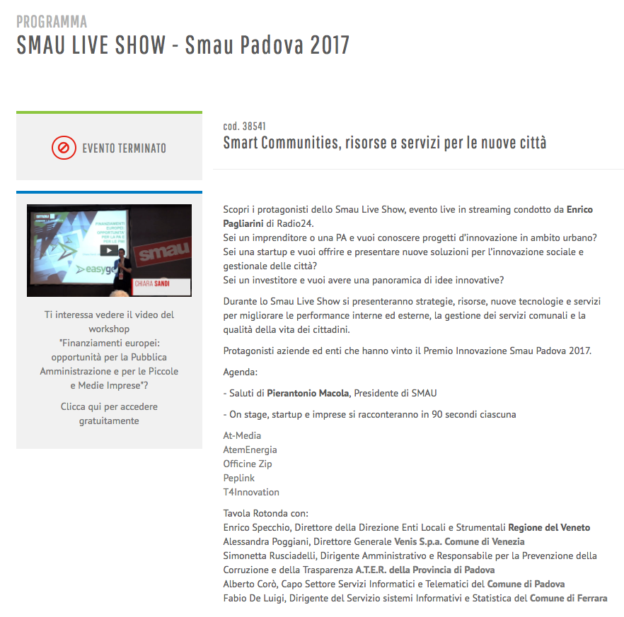 Link Esterno: http://www.smau.it/padova17/schedules/smart-communities-risorse-e-servizi-per-le-nuove-citta/